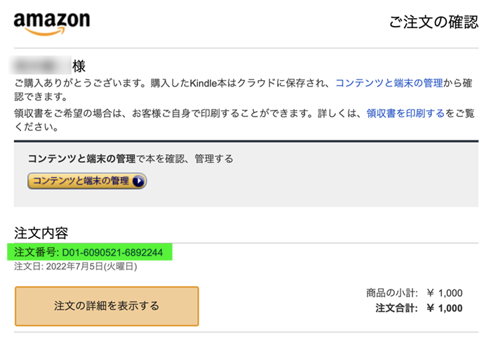 ※注文確定後の画面、もしくは、注文履歴から注文詳細などをご確認ください。下記の画像でグリーンのハイライトの部分が注文番号になります。
